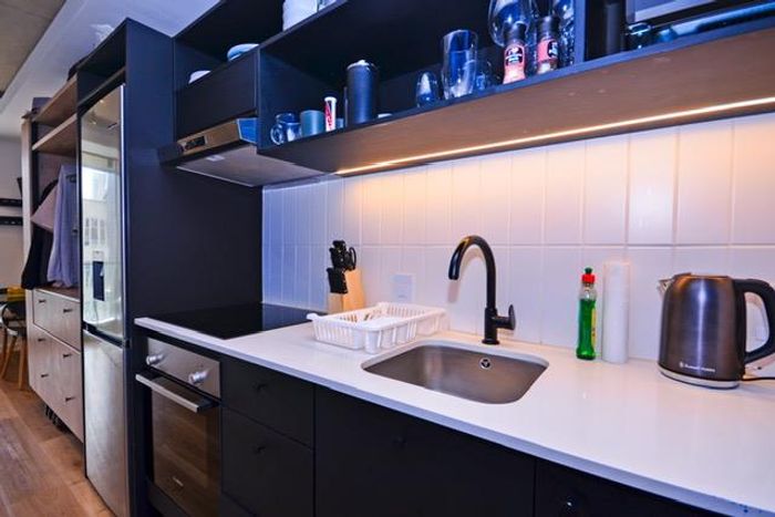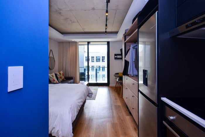 Wake up to Signal Hill views and morning sun in Station House, furnished studio with balcony, fitted kitchen and shower. Building amenities include rooftop pool and secure parking.