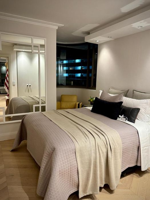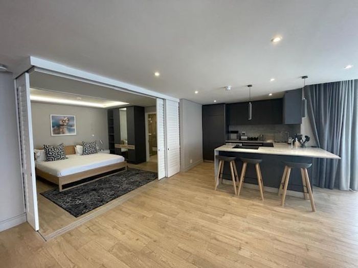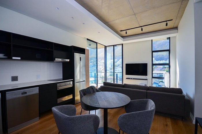 City-centre lifestyle living with panoramic Table Mountain views, sleek furnished studio ideal for corporate stays — one bed, one bath; building offers 24-hour concierge, pool deck, gym and bar.