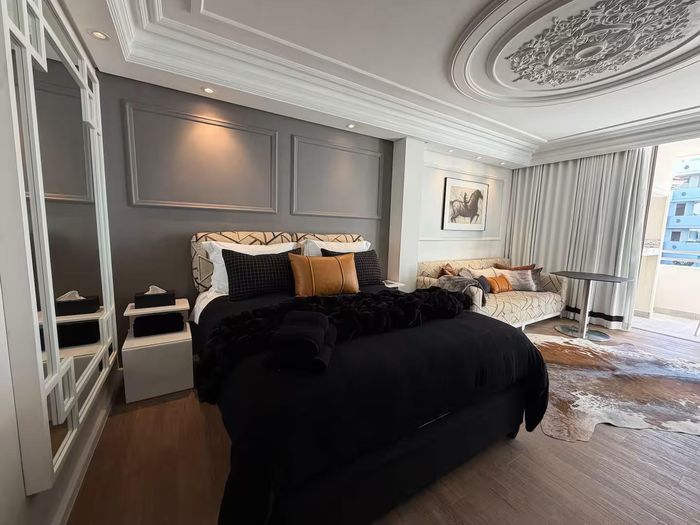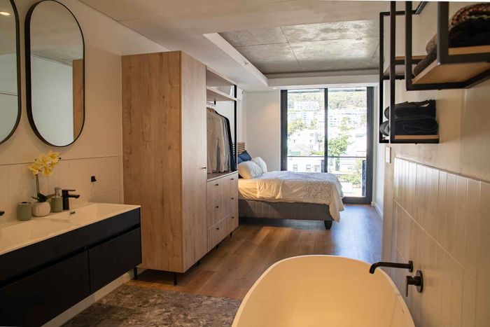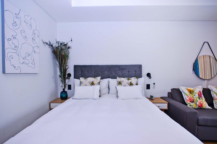 Live steps from Sea Point's vibrant dining and spa scene in a furnished studio with balcony, queen bed and smart TV; building boasts rooftop pool, gym and communal workspaces.