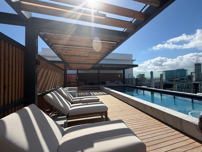 Embrace waterfront living at the V&A Waterfront with rooftop pool and Table Mountain views, private balcony and direct Battery Park access — one bedroom, one bath, secure parking.