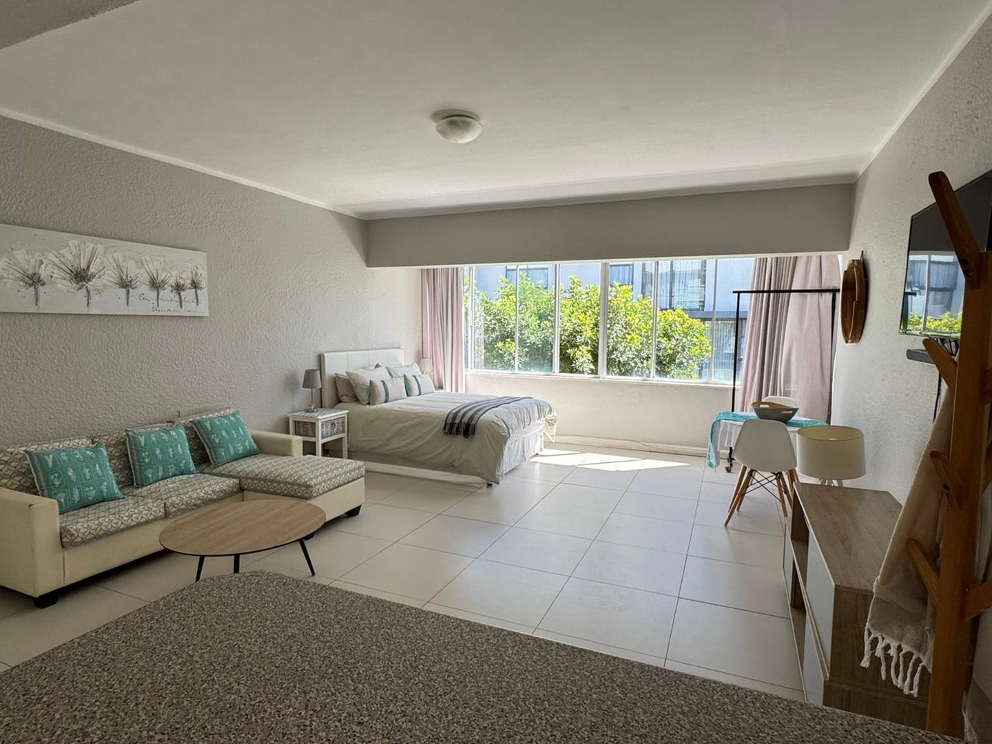 The open-plan living fits a double-sized bed and a sofa. This space is perfect for a couple looking for a welcoming home in a prime location.