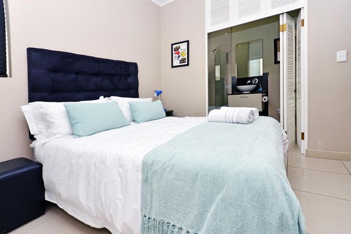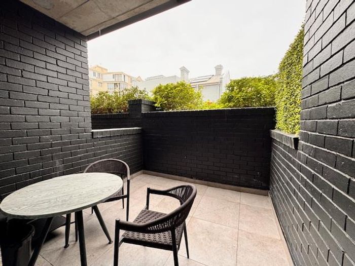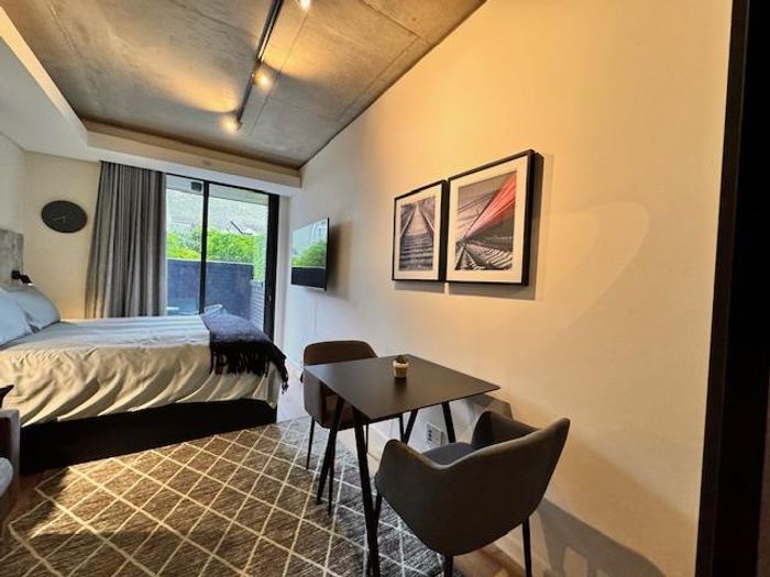 Live steps from Sea Point's vibrant dining and spa scene in a furnished studio with balcony, queen bed and smart TV; building boasts rooftop pool, gym and communal workspaces.